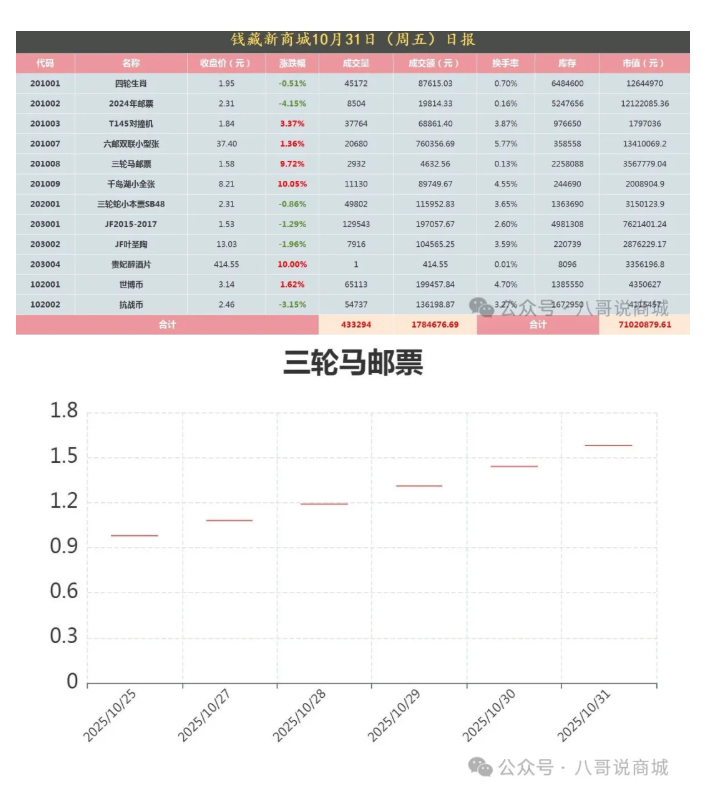 三轮马邮票 涨幅 9.72% 开盘价1.58元 收盘价1.58元 托管户筹码有松动,明年是马年、建议关注