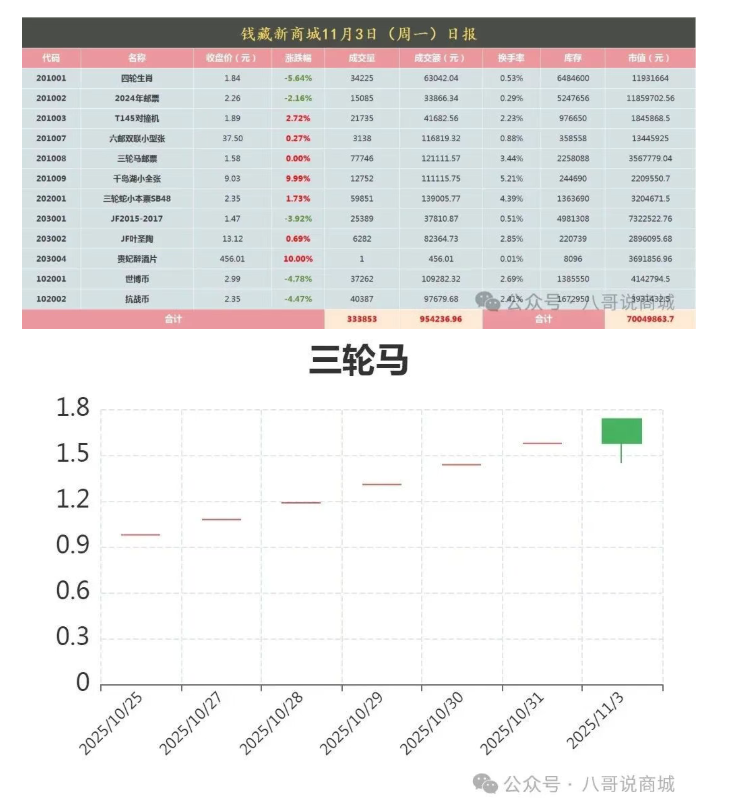 三轮马邮票 开盘价1.74元 最高价1.74.最低价,1.45收盘价1.58元 平盘报收,