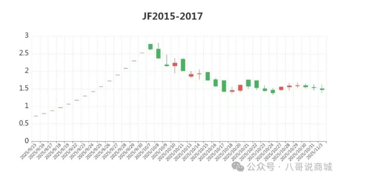 JF封15-17年单枚,开盘1.5元,最高1.62元,最低价1.38元,收盘价1.47元.跌3.92%