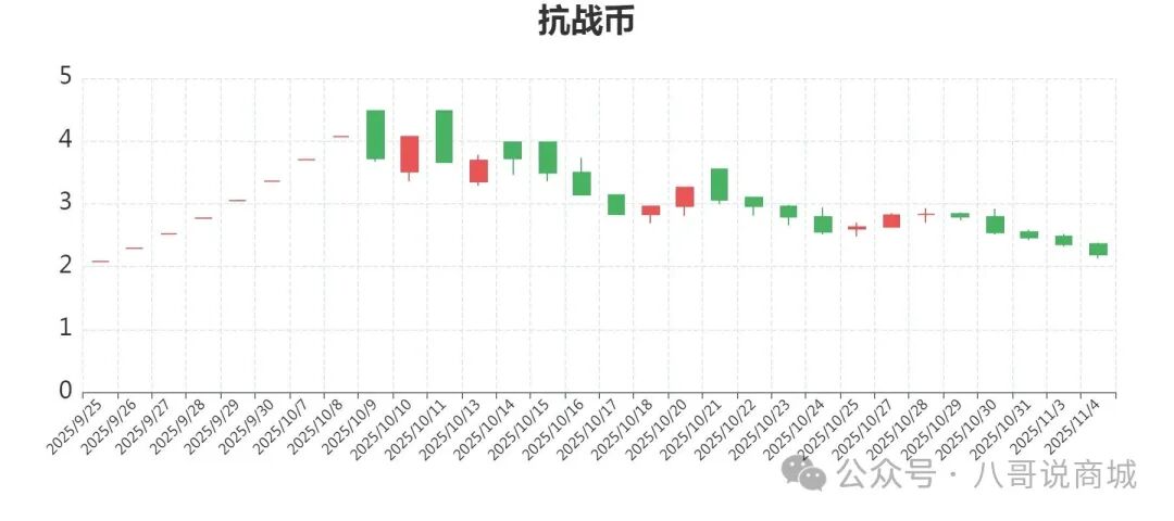 抗战币,开盘2.36元,最高2.38元,最低2.13元,收盘2.19元.跌6.81%