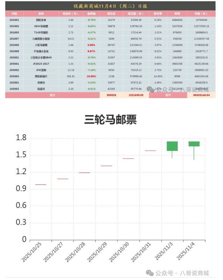三轮马邮票 开盘价1.74元 最高价1.74.最低价,1.42收盘价1.66元 涨5.06%今天震幅20个点,洗盘