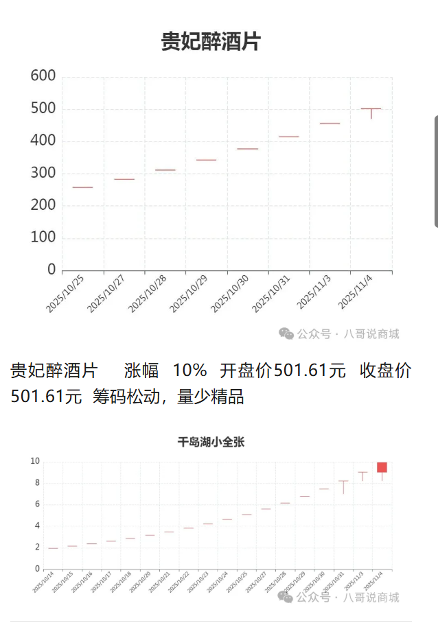 贵妃醉酒片 涨幅 10% 开盘价501.61元 收盘价501.61元 筹码松动,量少精品