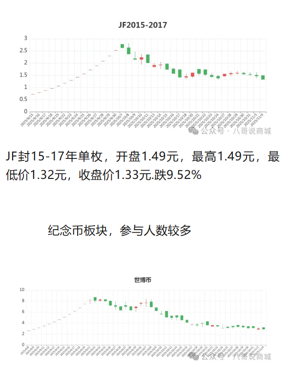 JF封15-17年单枚,开盘1.49元,最高1.49元,最低价1.32元,收盘价1.33元.跌9.52%