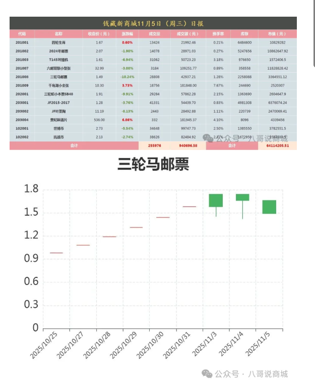 三轮马邮票 开盘价1.49元 最高价1.49最低价1.49收盘价1.49元 跌10%