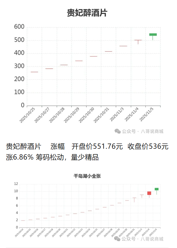 贵妃醉酒片 涨幅 开盘价551.76元 收盘价536元 涨6.86% 筹码松动,量少精品