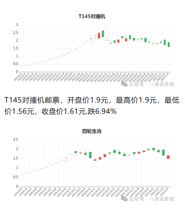 T145对撞机邮票,开盘价1.9元,最高价1.9元,最低价1.56元,收盘价1.61元.跌6.94%