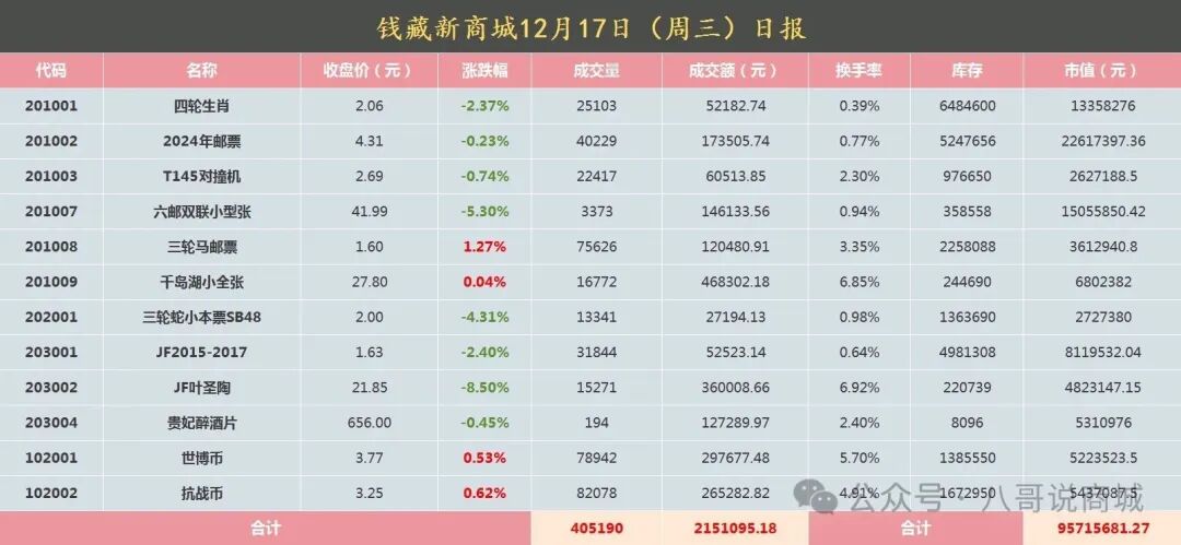 钱藏新商城在经历开盘之初的大涨和随后的长期调整之后,开始迎来第二波上涨潮。钱藏新商城第二波上涨潮的特点是潮头缓慢上涨,潮中加速上涨,潮尾疯狂大涨。现在只是潮头缓慢上涨阶段。在此阶段,大盘以进三退一的方式,推动大盘上的所有品种温和次第上涨。这种方式的上涨,如果以一个短周期观察,上涨非常明显。笔者以12月3日的最低价至12月16日的最高价作统计,来看上市品种的上涨幅度。12月3日的最低价与12月16日的最高价分别为:叶圣陶15.55元,25.25元;2024年邮票3.22元,4.22元;四轮生肖1.69元,2.14元;四轮马1.12元,1.64元;JF2015–2017年1.37元,1.49元;对撞机2.03元,2.84元;三轮蛇小本票1.74元,2.15元;抗战币2.39元,3.23元;世博币2.77元,3.76元。上述品种的普遍涨幅在百分之三四十左右,像叶圣陶的涨幅则接近百分之七十。 在这波上涨中,新上市的品种也赶上了好时候,如千岛湖小全张由上市价1.50元涨至12月16日的28.20元,涨幅高达19倍,是继叶圣陶之后的又一个高涨幅品种。 钱藏新商城的第二波上涨已经开始,投资者要勇立潮头,不要错过这挣钱的机会。因此,加大投资是投资者赚取更大利润的不二选择。