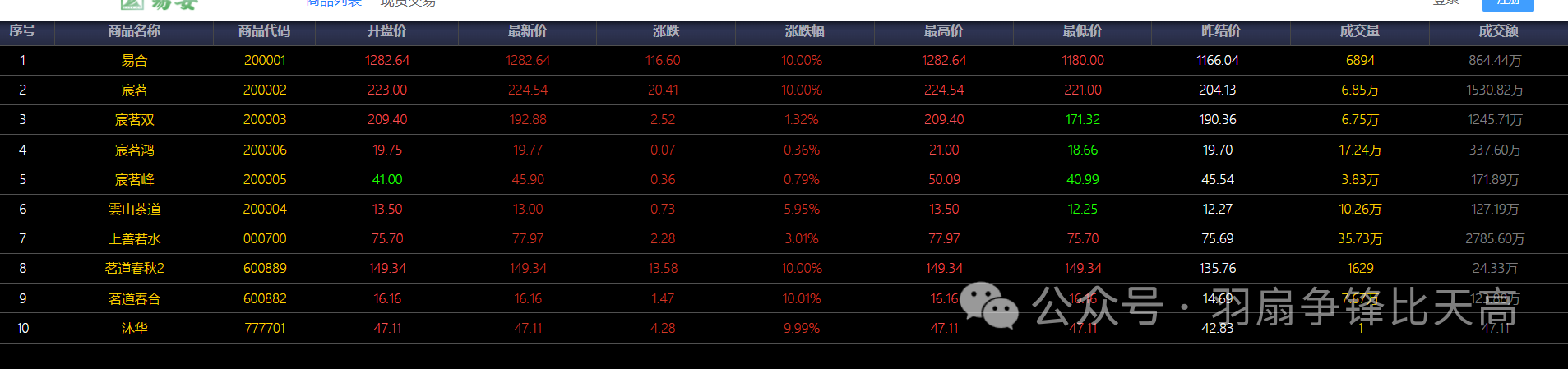 易安从2025年开启后一度高开低走,经历三四个月的沉淀,整个易安大部分品种都处于历史低位,经历十月份的沉淀,易安逐步具备创造大行情的氛围。HCY作为基石品种,稳步做流量行情,未来可期;茗道春秋系列战略布局跨年行情;宸茗系列稳扎地基,以全新姿态塑造行情新标杆,活跃板块即将成为易安的牌面。近期盘面变化有点较大,瑞盈达仁(奶瓶总)一票易合正式官宣启航,强势拉升突破千元,成为行业品种标杆,原汁原味的电子盘又回来了,粉丝朋友们可以呼朋喊友速归!同时下周酒瓶总也进驻易安,多个强势挂牌方全线入驻易安!全体易安和挂牌方旨在打造电子盘原汁原味的平台,塑造以交易为核心的平台,打造在安全地方赚钱更容易的平台!