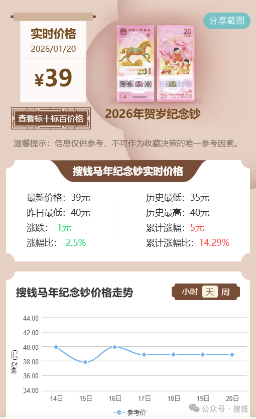 马年纪念钞:散钞通货批量成交在38-40元 / 张,标十价格在390元左右。