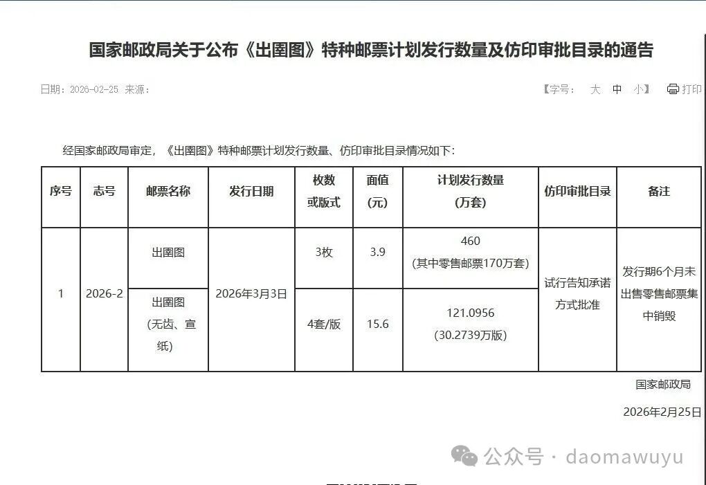 在《出圉图》正式发行前,发行量率先公布。邮政官宣:无齿30万版,有齿460万套。