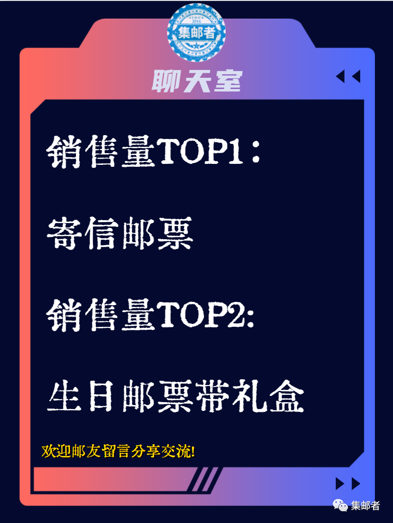 根据某宝的销售排行搜索,销售量最多的是打折的寄信邮票,其次是带盒子的礼品邮票,如生日快乐,岁岁平安。