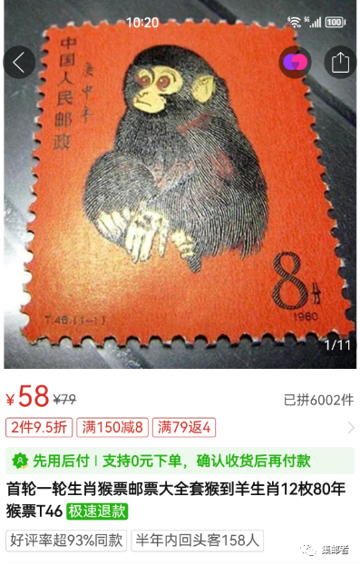 而拼XX完全不一样,58元的一轮生肖猴票大全套,销售量最高...用户群体明显不同,已收到多位新手邮友询问价格都是买在拼XX上买的假票...