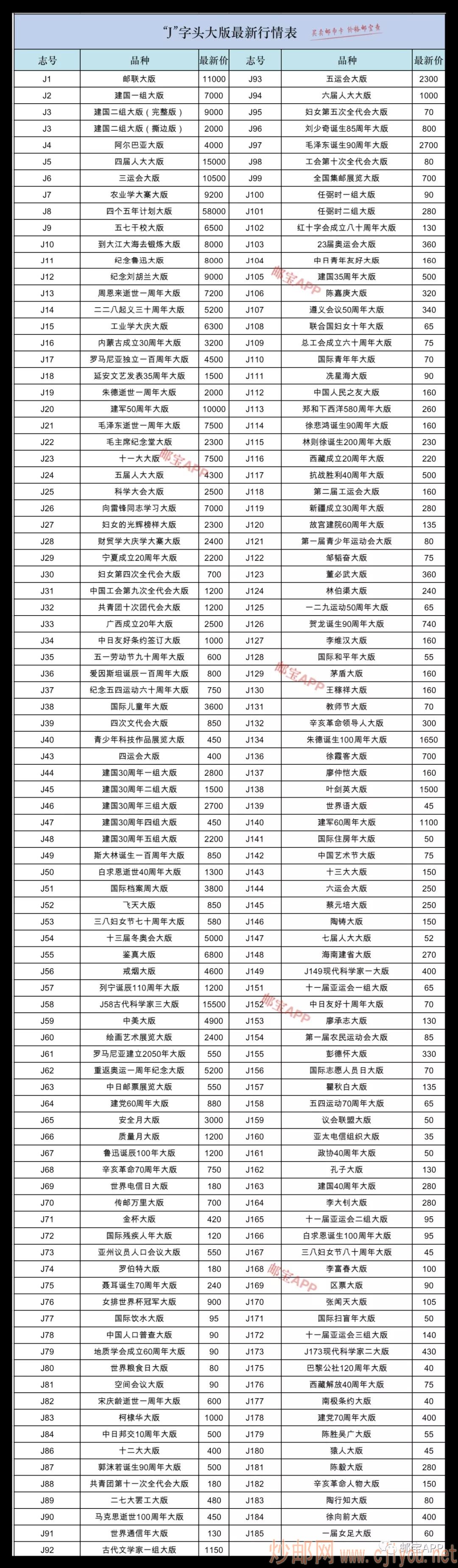 “J”字头大版最新行情 日期:2021-03-16 “J”字头大版最新行情 邮宝APP ·· 特别提醒:邮宝APP中所有产品的价格为市场大宗交易价格、且不含税点。零售价可能在此基础上浮动10-20%。另外,因篇幅所限,本文亦未列出邮币卡的所有品种。查询更多价格,请登录邮宝APP