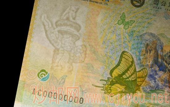 ③有色荧光号码:采用荧光凸印技术,冠字号码具有钢印效果,在紫外灯照射下,呈现荧光效果。