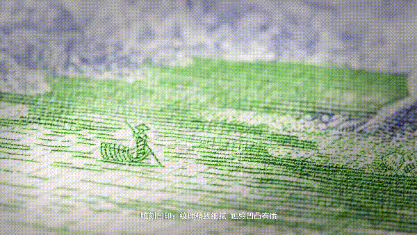 ⑦凹印OVI:OVI光变油墨及雕刻凹印技术,独特的雕刻凹版工艺,触摸票面会有明显的凸起感,在光源下,根据光的入射角和视觉角下,可以清晰的看见logo由紫红色变绿色。