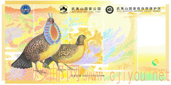 该券共发行5个规格,分别为单体券、双连体券、三连体券、四连体券、大炮筒(24连体),正面主景为武夷山玉女峰、九曲溪,以及珍稀动物—金斑喙凤蝶,底纹衬有大红袍茶叶、茶圃和蝴蝶等元素。背面主景为国家一级保护动物—黄腹角稚,被称为鸟中“熊猫”。