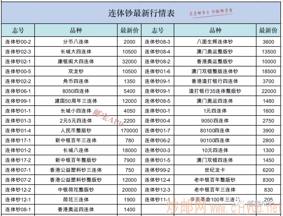 连体钞最新行情 日期:2021-04-15 连体钞最新行情 邮宝APP ·· 特别提醒:邮宝APP中所有产品的价格为市场大宗交易价格、且不含税点。零售价可能在此基础上浮动10-20%。另外,因篇幅所限,本文亦未列出邮币卡的所有品种。查询更多价格,请登录邮宝APP行情连体钞最新行情 注:转发或引用内容文字或图片请注明出处为邮宝APP