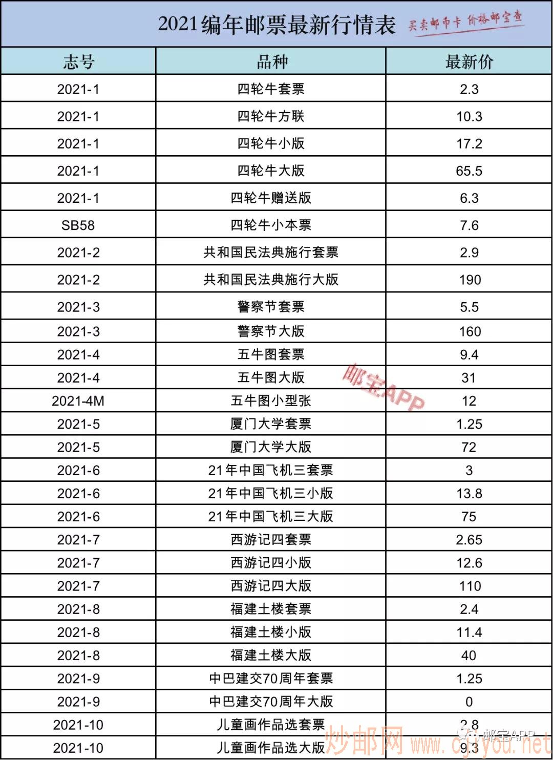 2021年编年邮票最新行情 日期:2021-06-06 行情2021年编年邮票最新行情表 注:转发或引用内容文字或图片请注明出处为邮宝APP 邮宝客服电话:400-8788-498邮宝PC端网址(https://www.youbao360.com)现在立即登录邮宝!15万收藏者等您交易!
