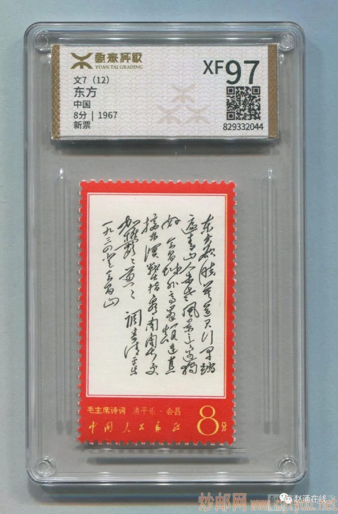 3天前一枚文7全品的东方新票以1.35万元成交,此次XF97绝品的文7东方新票,相比未入盒的邮票价格,涨幅近3倍!