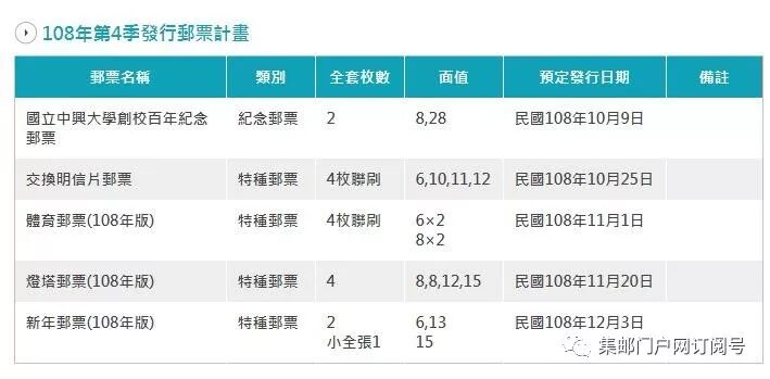 台湾中华邮政2019年第4季度邮票发行计划今天正式公布