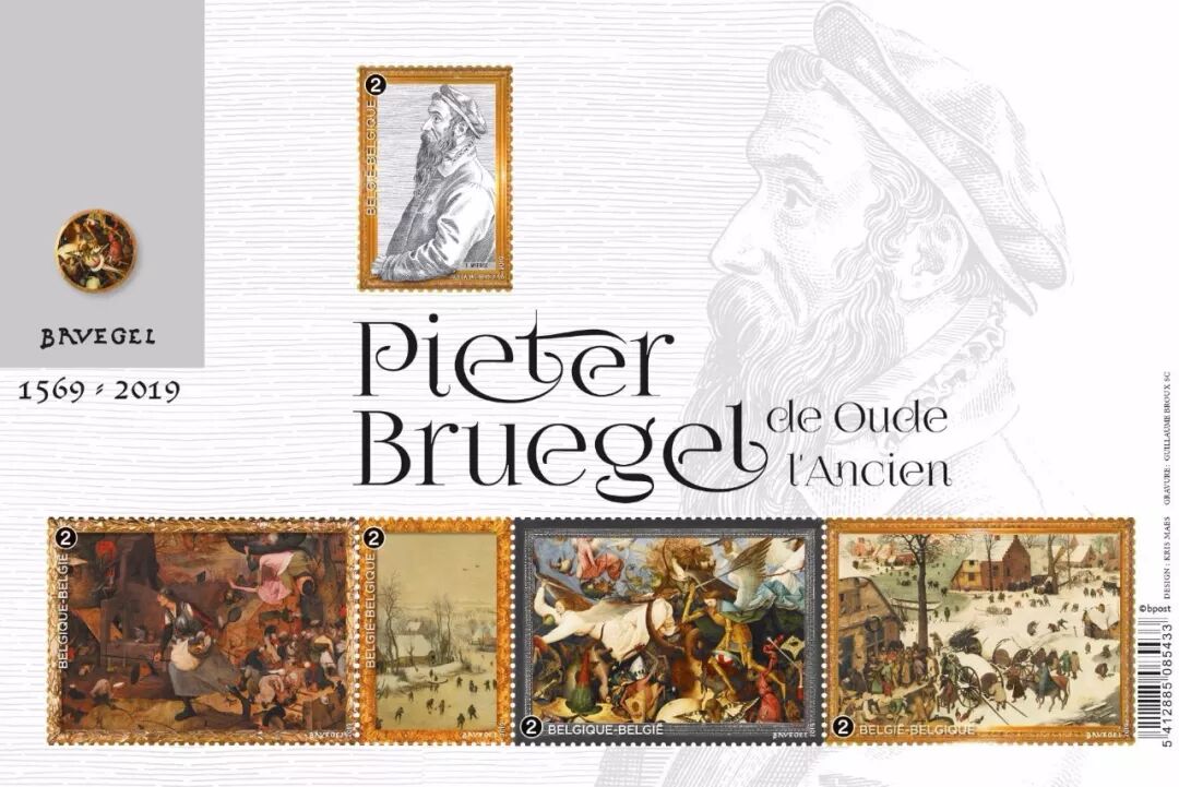 2019年8月26日,比利时邮政发行一套5枚《绘画大师》系列邮票,展现16世纪尼德兰最伟大的画家老·彼得·勃鲁盖尔(Pieter Bruegel the Elder, 1525-1569年)的作品。他是欧洲独立风景画的开创者,同时被誉为专画农民生活题材的天才。老勃鲁盖尔是与意大利艺术风格相区别的最后一位尼德兰画家,因为在他之后尼德兰艺术已同意大利逐步趋于一致。老勃鲁盖尔的艺术继承了尼德兰的传统,反映了16世纪尼德兰的社会风貌,具有形象朴拙、手法简括、高视点、平面、全景式的构图等特点。