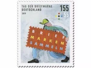 2019年9月5日,德国邮政发行一枚今年的《邮票日》系列邮票。这枚邮票面值为1.55+0.55欧元,其中0.55欧元是附捐邮资。邮票由Peter Krüll教授设计,图案为一位集邮爱好者在向大家“炫耀”自己的邮品收藏。