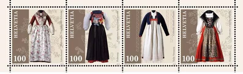 2019年9月5日,瑞士邮政发行一套4枚《传统服装》邮票,介绍勒奇谷、弗里堡、维尔扎斯卡山谷和恩加丁四个地区在18和19世纪时的服装。邮票图案上的服装原件现在都收藏在瑞士国家博物馆。