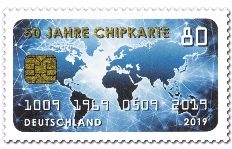 2019年9月5日,德国邮政发行一枚邮票,纪念芯片卡技术问世50周年。1968年9月13日,德国工程师Juergen Dethloff (1924—2002) 和 Helmut Groettrup (1916—1981) 在奥地利申请了一项“识别电路”的专利。该“识别电路”的目的是接收所提供的信息并为其分配特定的含义。1969年9月10日,同样的专利申请在德国提交,该专利已通过电感耦合提供无线传输。这种芯片卡弥补了磁条卡在欺诈保护方面的缺陷,因此更加可靠。两位德国工程师在芯片卡的突破性技术及其发展中起到了决定性作用。