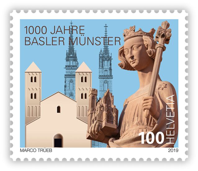 2019年9月5日,瑞士邮政为巴塞尔大教堂1000周年发行一枚纪念邮票。巴塞尔大教堂是巴塞尔的地标性建筑,也是瑞士国家的重要文化遗产。这座教堂始建于1019年,是献给当时的神圣罗马帝国皇帝亨利二世和他的皇后的,以感谢皇帝赋予巴塞尔大主教对城市的统治权。邮票图案上的雕塑就是教堂入门处的亨利二世的雕像。